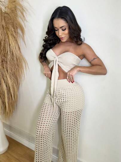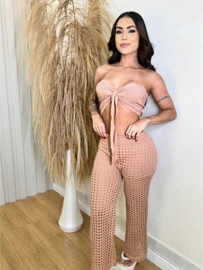 Conjunto Tricot Crochê Calça e Cropped Premuim, Moça Moderna
